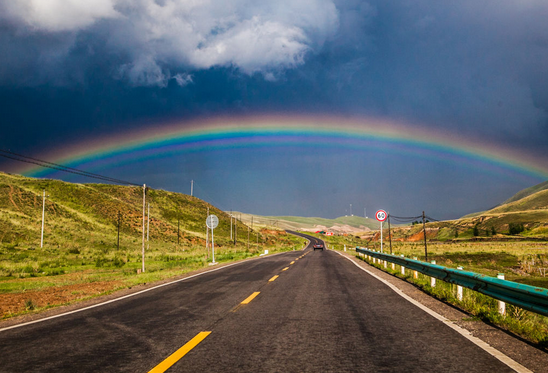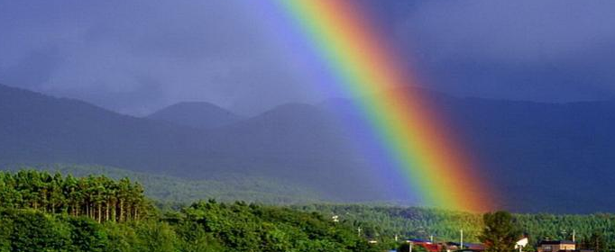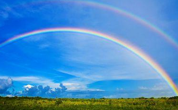 彩虹之所以都是弯曲的,也跟光穿越水滴时弯曲的程度和光的颜色有关。红色光的弯曲度最大,紫色光的弯曲度最小,所以,我们经常看到的彩虹,蓝色总是在红色下面。如果我们所在的位置适当的话,还可以看见圆形的彩虹呢!