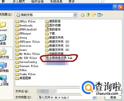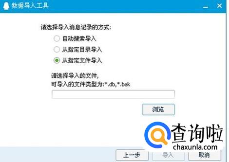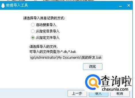 在选择导入方式时,选择“从指定文件导入”,再点下面的“浏览”,按照导出的路径找到聊天记录,双击添加,再点下面的“导入”。