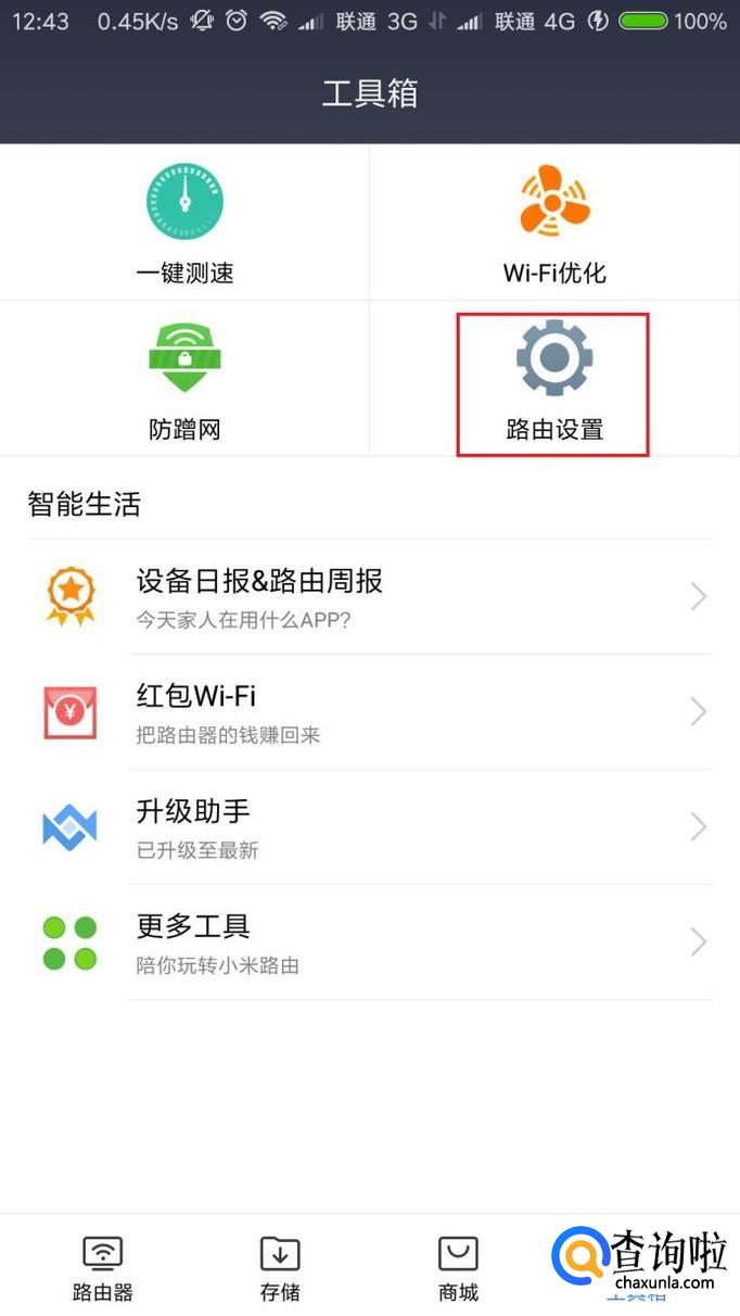 接下来,打开工具箱页面之后,点击页面顶部“设置”按钮,打开路由器设置页面。