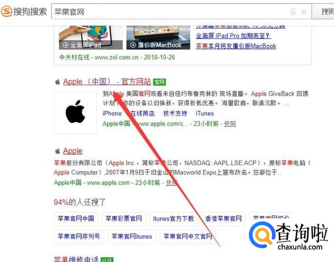 进入之后,搜索“苹果官网”,点击并进入,如图所示。