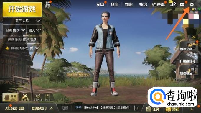 打开我们的刺激战场,来到主界面,点击右上角的“设置”。