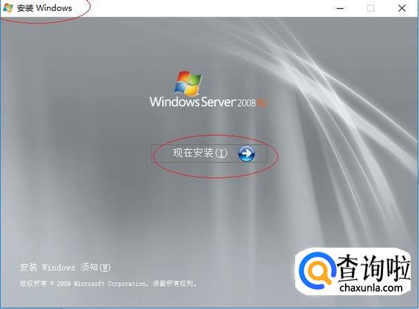 唤出"安装Windows"程序窗口,如图所示。点击"现在安装"图标向右箭头,开始安装Windows Server 2008 R2操作系统。