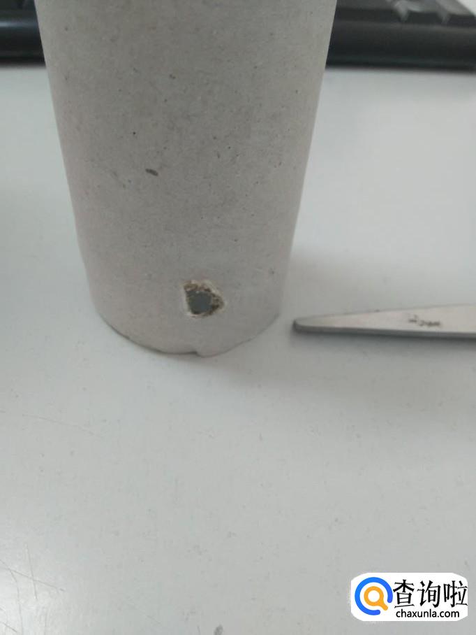 用剪刀在卷纸筒的一端扎一个孔。