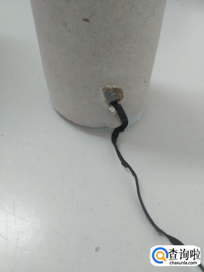 将粗绳的一头穿进纸筒上的小孔中。