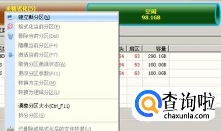 这时原来的空间颜色会变成绿色,我们在这上面再点击右键,选“建立新分区”。
