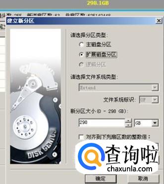 我们的移动硬盘只是当存储工具,不需要设“主磁盘分区,”就选“扩展磁盘分区”,分区大小不用改,点下面的“确定”