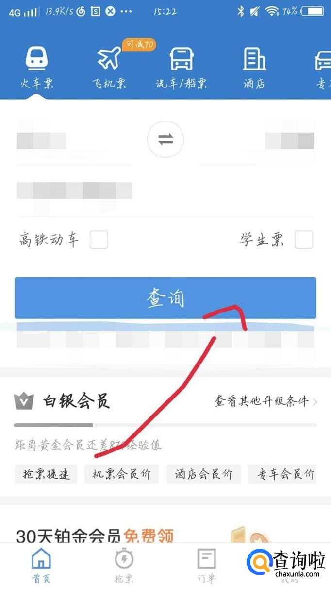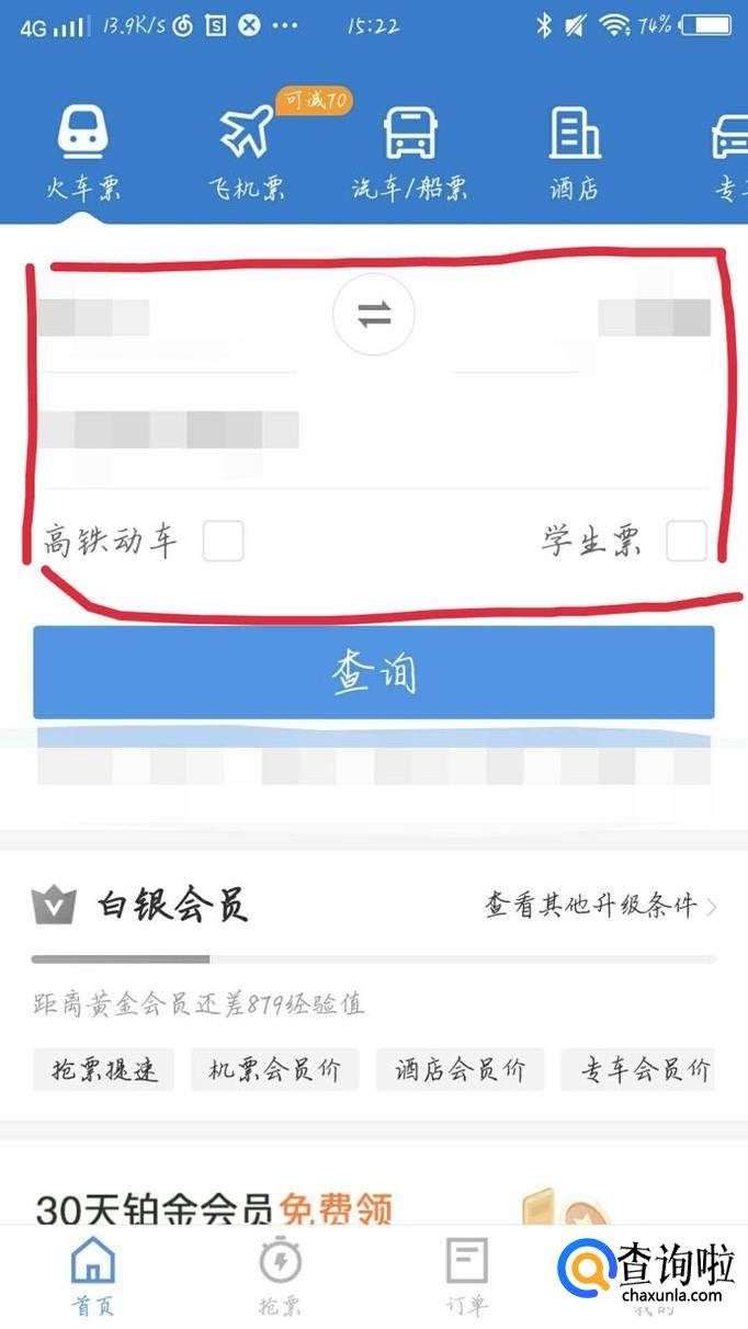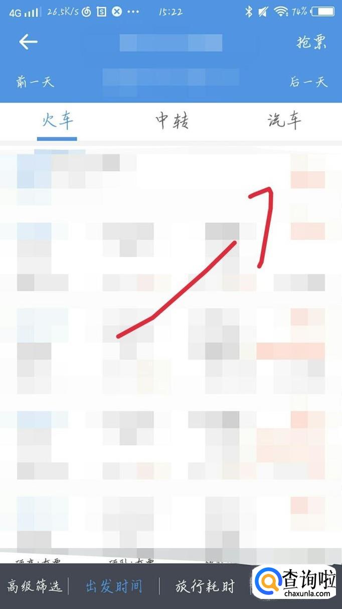 在如图1框框所示的这个区域内,输入你的出发地点和目的地,还有出发的时间等。点击“查询”选项,如图2箭头所示。