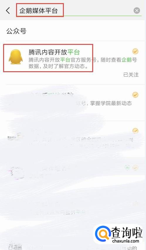 在“添加朋友”界面找到“公众号”,搜索“企鹅媒体平台”,点击如图搜索结果。
