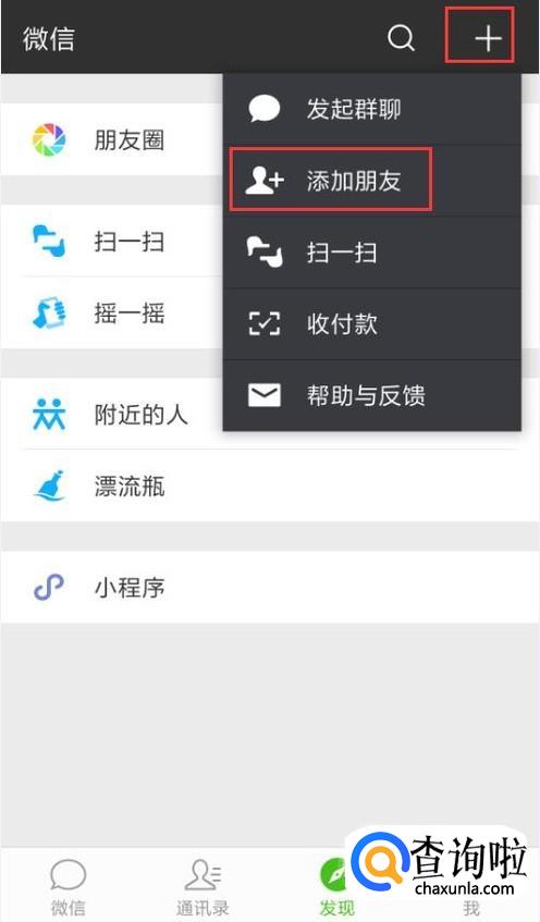 打开微信App,点击右上角的加号,点选“添加朋友”。
