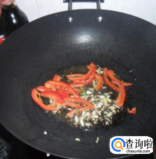 然后热锅,锅中放油,把刚刚切好的姜末蒜末和彩椒条放入锅中煸炒半分钟左右盛出。