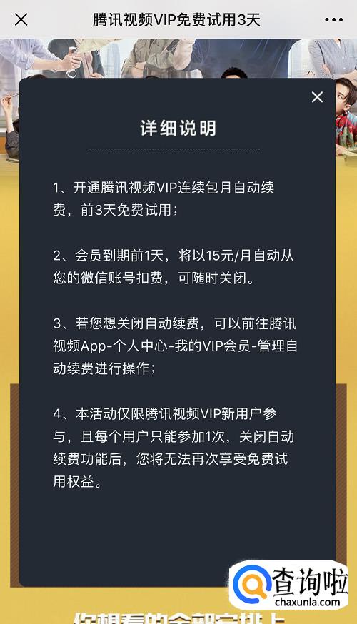 我们点击该选项,进入详情页面,这个页面上会对该功能有一个详细的说明,如果想免费领3天会员,只能是新用户才行,如果你的QQ号已经买过会员了,那就直接再注册一个QQ号,用新注册的QQ来领这个福利。