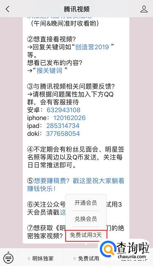 关注成功后,在下方工具栏中点击【免费试用】,然后在弹出的列表中就可以看到【免费试用3天】。