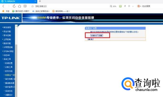 在主界面选择“系统工具”栏,选择“恢复出厂设置”。有的路由器版本不同,可能直接就显示“恢复出厂设置”。选择“恢复出厂设置”后,复选“确定”。路由器一般会耗时2-5分钟进行恢复出厂设置。