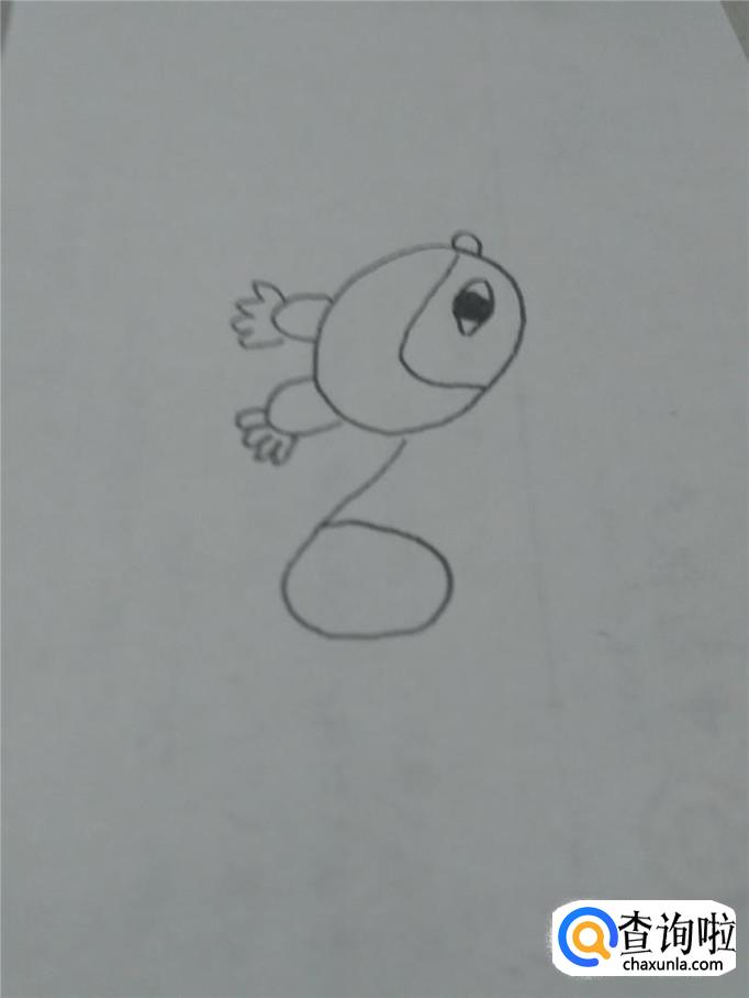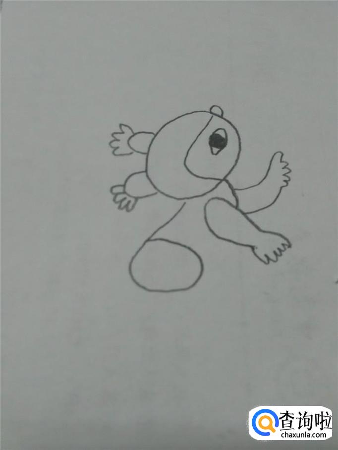 在头的右下方,画出两条又粗又短的胳膊,在胳膊末端画出五个小手指。