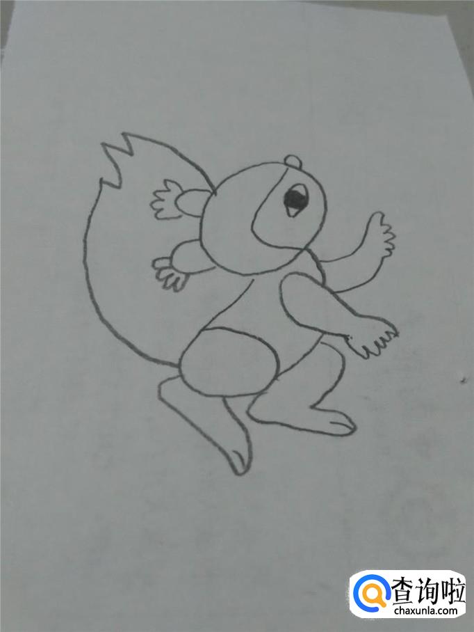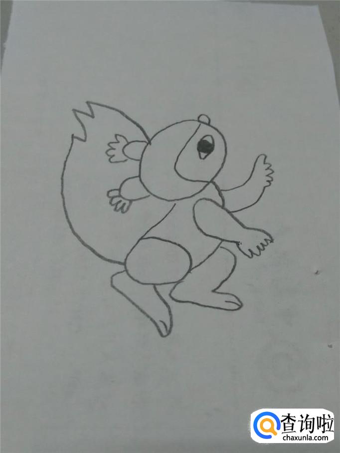 最后,从耳朵到屁股之间画一个大大的火苗形状,表示松鼠的大尾巴,到这里,小松鼠就画完了。
