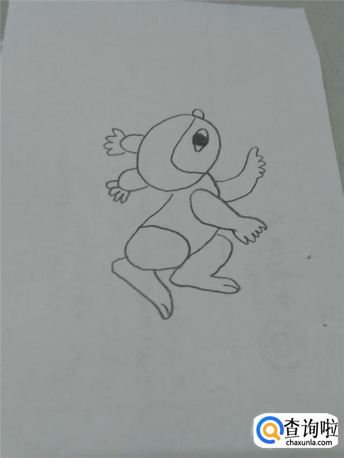 在胳膊下方画一条后腿,腿根处画粗些,从腿的下面画一条横着的脚,脚的末端画一条小短线,表示脚趾。在6的下面,画一个细长条,表示脚,在脚的右端也画一条短线,表示脚趾。