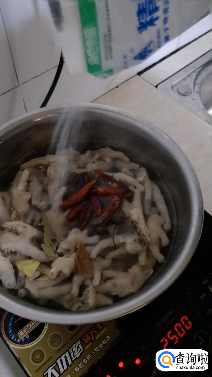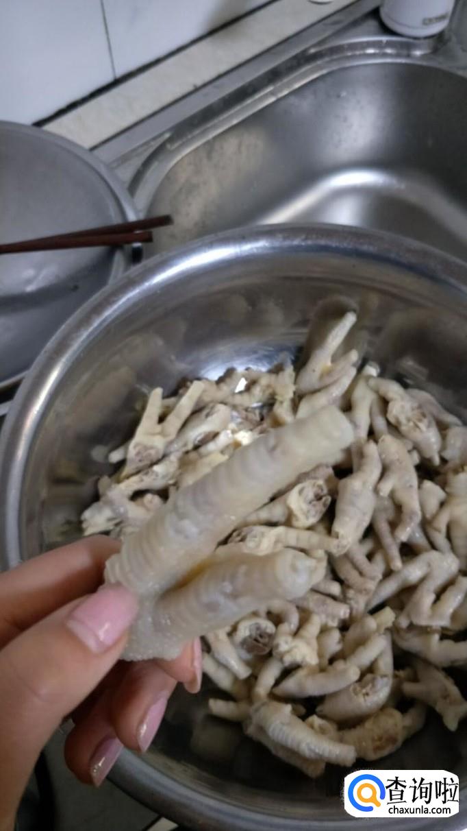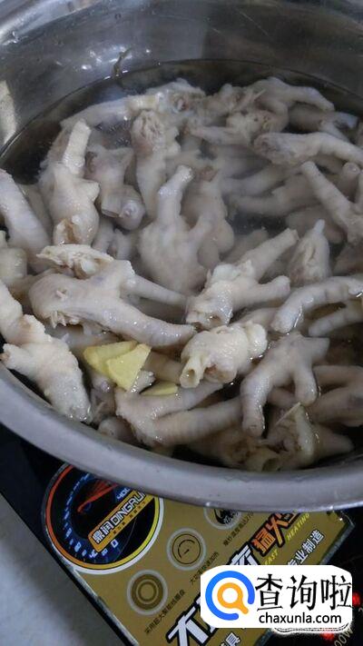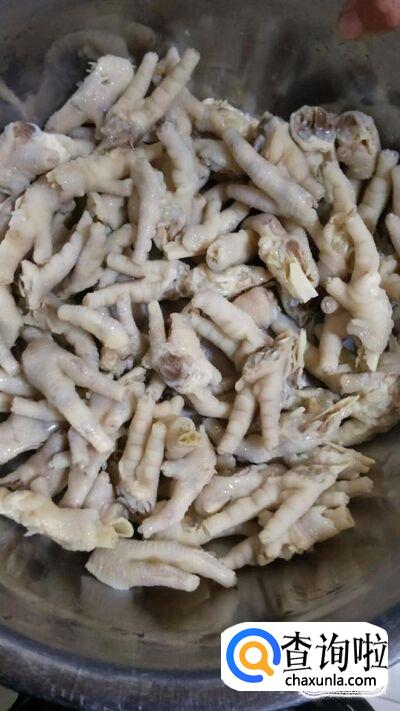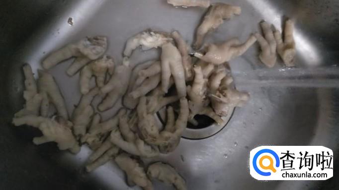 凤爪煮好后捞出,用凉冷的白开水浸泡五分钟。这样做的目的是让凤爪快速冷却,同时防止凤爪冷却后粘连在一起。