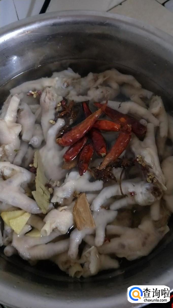 依次向锅中加入适量花椒粒,八角,桂皮等香料,少量干辣椒,和适量盐,盐可以稍微多放一点,可以让凤爪更入味。
