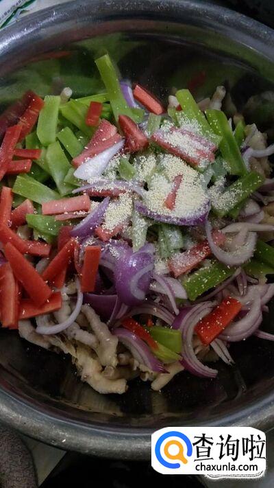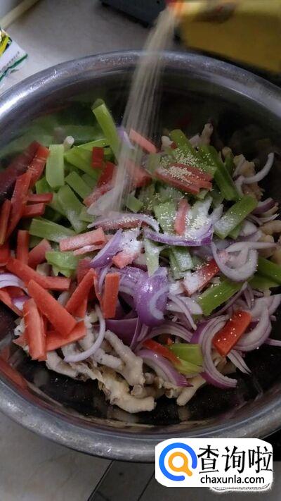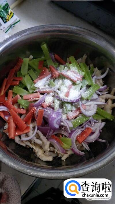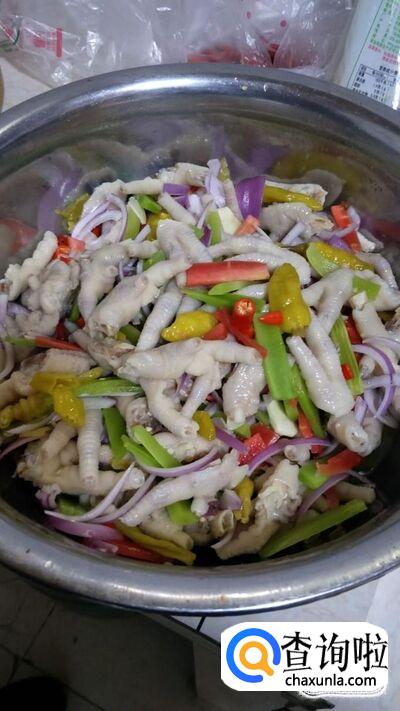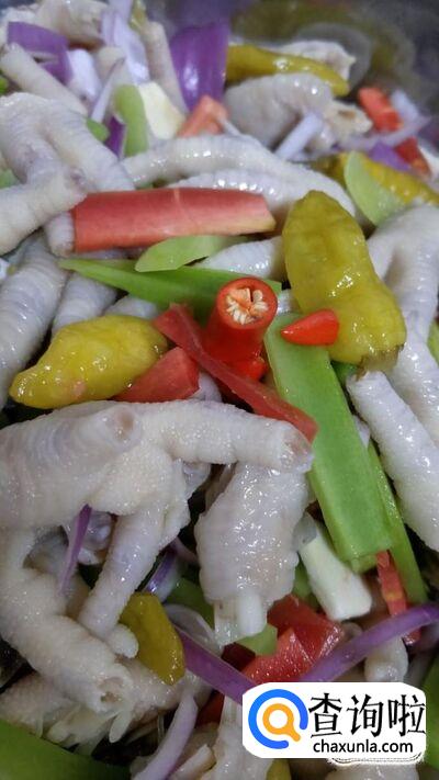 将凤爪装入小盆中,将准备好的配菜倒入,再加入适量食用盐,味精,鸡精(鸡精可以稍微过量)。