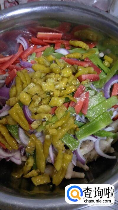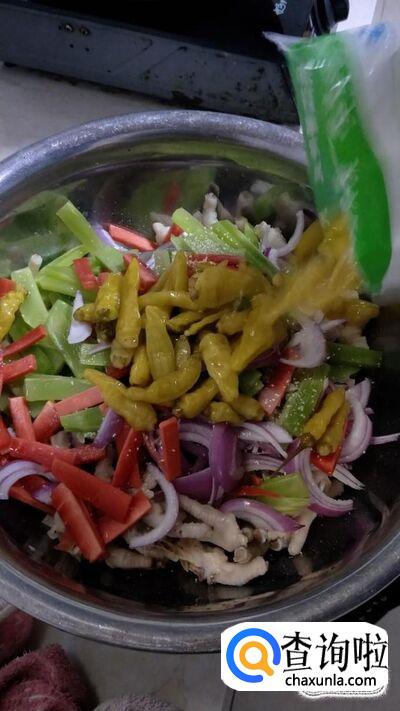 接下来的一部也是最后一步,向凤爪中加入泡山椒,泡山椒可以多点,喜欢更辣的可以先将泡山椒切成小段,辣味更加足,再把泡山椒的水也一起倒入,如果家里有泡菜水的再倒入少量泡菜水,没有的话就直接倒入少量凉白开。
