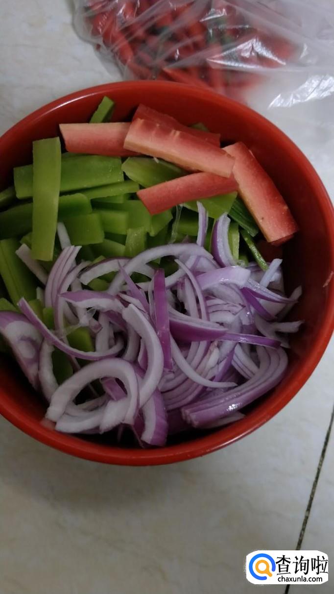 准备配菜。将胡萝卜和莴笋切成粗细均匀的条状,再将洋葱切丝。装入碗中备用。