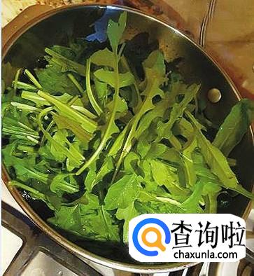 锅烧热,然后,将蒲公英放入进行翻炒。待出水后,将水倒出。继续大火翻炒。
