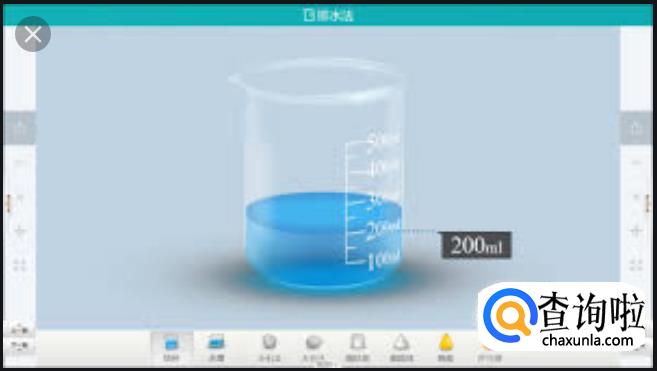 举个例子,利用【学科工具】进行排水法的演示。首先,你看到页面最初始是这样的:正中央是一个烧杯里面有少许水,并且明确标明了准确的数值,而右下方的工具栏可以看到七个图形,包括烧杯、水槽、小石头、大石头、圆柱体、圆锥体、鸭梨。