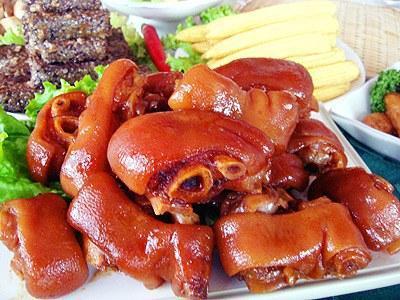 用料:猪蹄4个、葱1段、姜1块、蒜2瓣、腐乳(红)2块、八角1颗、桂皮1段、香叶2片、茴香籽1/3茶匙、色拉油2汤匙、冰糖1小把、老抽1汤匙、料酒1汤匙。猪蹄先放在清水里浸泡2小时以上。然后洗干净,摘干净皮上的毛,然后放在冷水中开大火焯水,焯水的时候不盖盖子。待水开四面颜色变白捞出,再用开水将猪蹄上的沫子冲干净;炒锅中放入适量色拉油,放入适量冰糖,中火炒糖色;炒至冰糖溶化,颜色变成焦黄色。放入猪蹄,立刻转小火翻炒至皮都变成金黄色;然后放入适量的老抽、料酒、葱、姜、蒜、八角、桂皮一起翻炒一下;放入适量清水。水开后撇去浮沫。将酱豆腐捣碎放入,小茴香和香叶装在调料包里一同放入;开锅后盖上锅盖转小火炖2小时,炖到一小时的时候,放入适量盐进去调下味;炖两个小时后转大火收汁,待汤汁差不多收干关火即可。