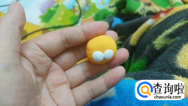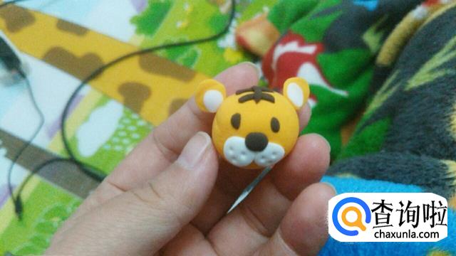 然后再拿两块白色的超轻粘土,把它们做成小球,然后再压扁,贴在老虎的嘴巴附近,当成是老虎脸上白色的皮肤。