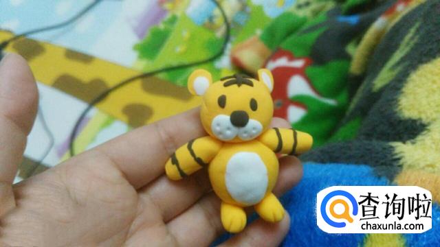 然后再用咖啡色超轻粘土搓成长条,裹在老虎的手臂上,当成是老虎身上的棕色花纹。