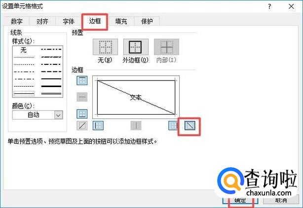 弹出的界面,我们点击边框,然后我们点击斜线,之后点击确定;