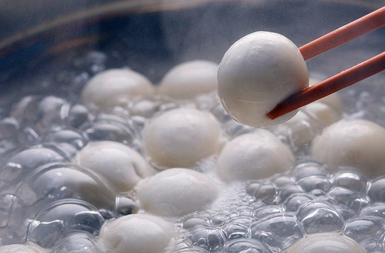 轻轻捏开水下锅,在下锅前用净手微捏,使外皮上略有裂痕,这样下锅不会夹生且软滑可口。待水烧开放入锅内,同时应用勺将其推开、朝同一个方向略作搅动,使其不粘锅。旺火煮上片刻浮起后,迅速改小火慢煮,否则会使其外熟里生不好吃。在煮的过程中,每烧开一次就要点入适量冷水,使其保持似滚非滚的状态。