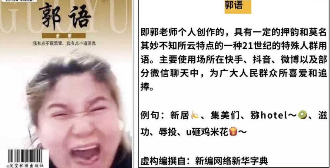 她常常会说一些让人觉得匪夷所思却又引人发笑的话,再配上她使用的那些独特的发音,就形成了个人风格极强的口音。比如“猕猴桃”被她称作“迷hotel”,还有“酸奶蛋糕”被她称为“孙乃定沟”,油炸鸡米花、草莓、红心火龙果等也都被“重新取了名字”,这种说话方式在后来引起了网友们的模仿,被称为“郭语”。