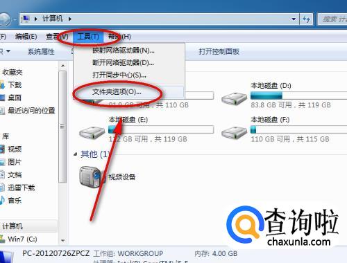 打开“我的电脑”,然后点击“工具”,在弹出的下拉菜单中点击“文件夹选项”。