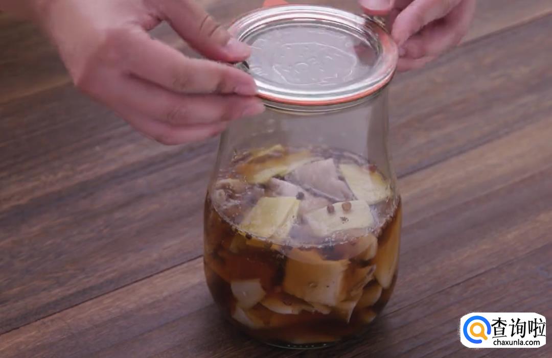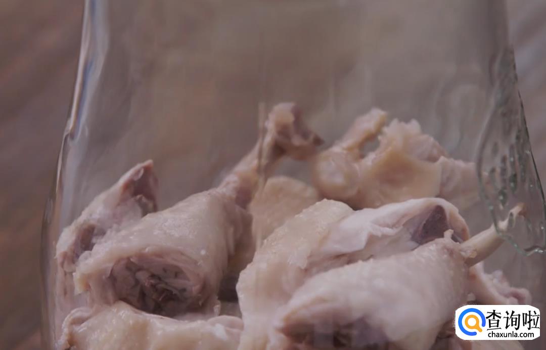 放入姜片、醉鸡汁浸泡鸡肉,再倒入一点高粱酒后密封起来。冷藏一天后就可以开盖食用了。