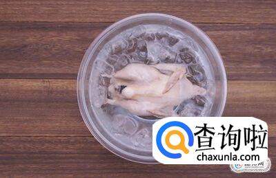 放入童子鸡小火焖煮10分钟后翻面,再焖煮10分钟,如果鸡较大只就煮久一点。煮熟后捞出来放冷水里2分钟。