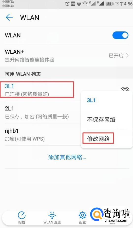 弹出的界面,我们长按我们连接的无线网络,弹出的界面,我们点击修改网络;