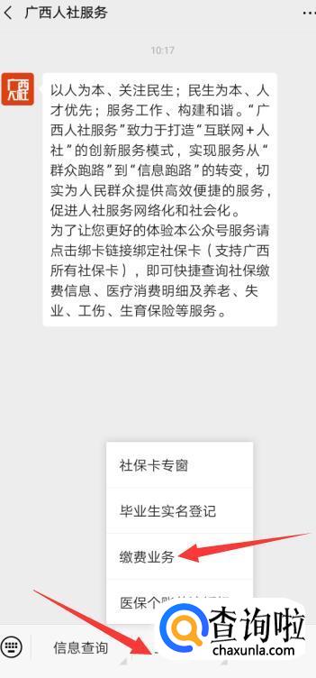 打开公众号,点击底部的“业务办理”按钮,并选择“缴费业务”。