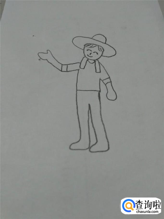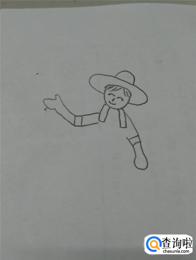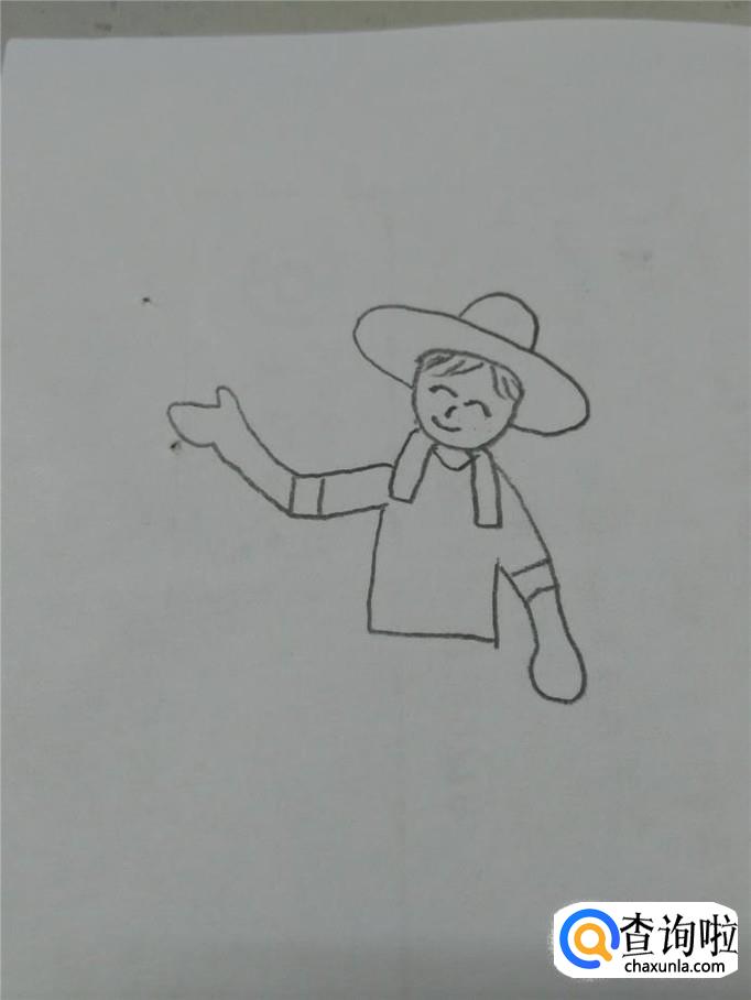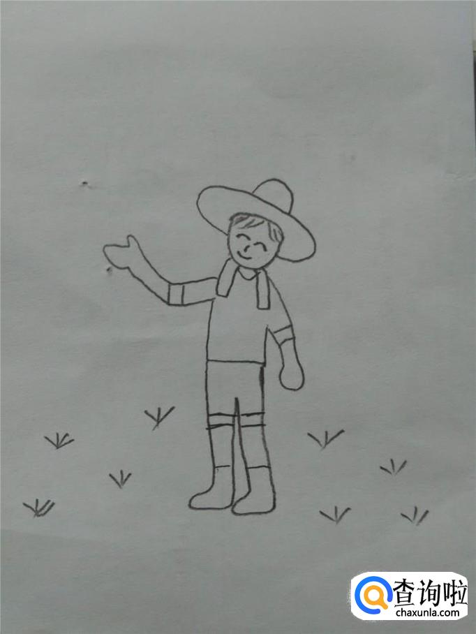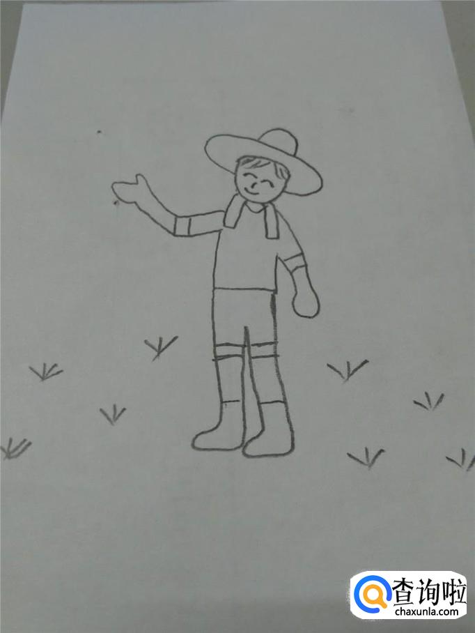 最后,在腿的周围画一些相交的小短线,表示秧苗,戴草帽的农民就画完了。