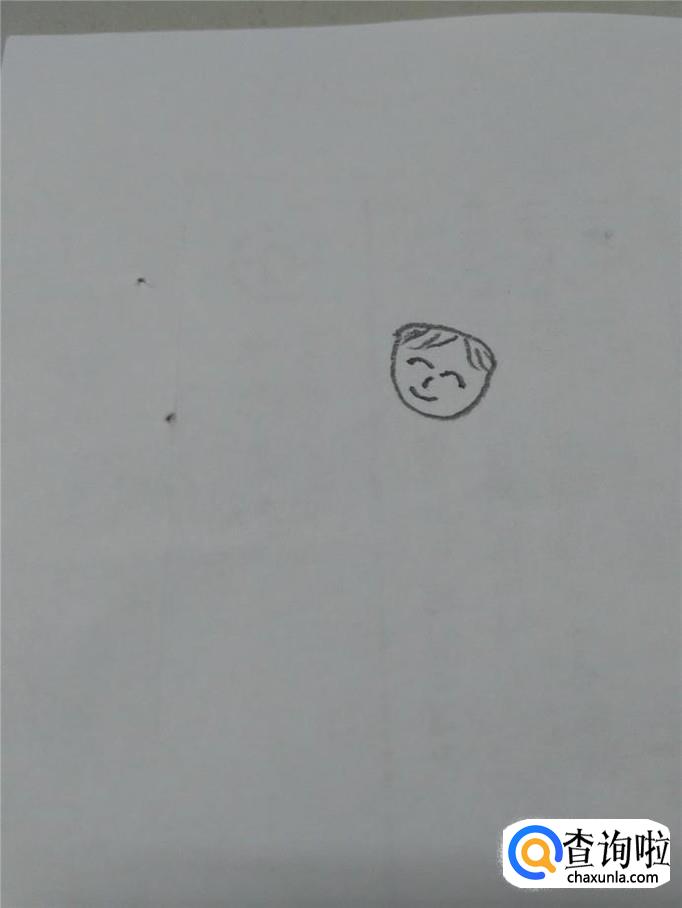在头发下面,画两条向下的弧线,表示眼睛,在眼睛下面画一条向左的短弧线,表示鼻子,在鼻子下面,画一条向上的弧线,表示嘴。