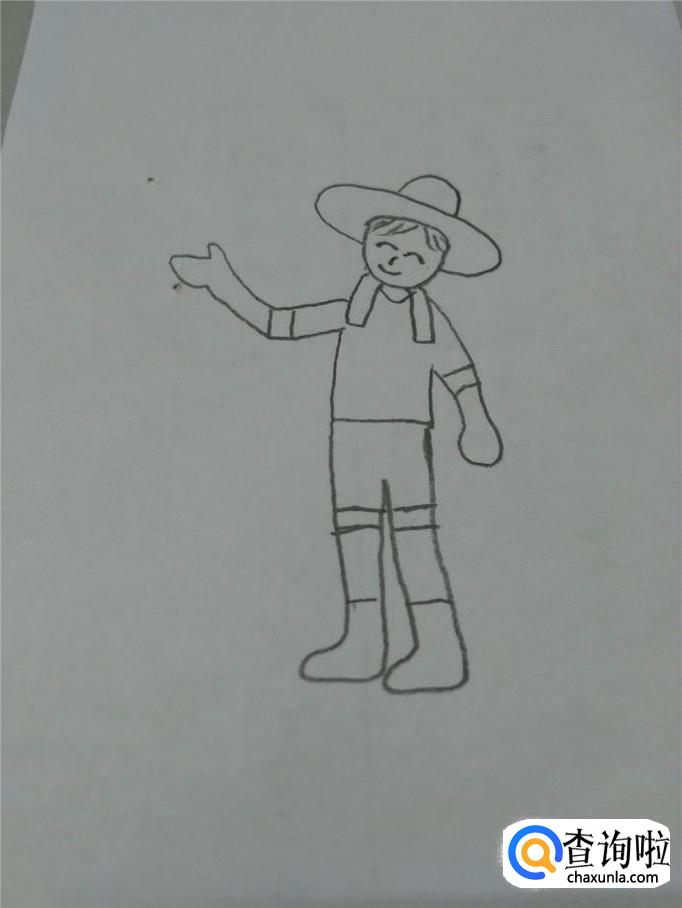在腿的中间,各画两条短线,表示挽起的裤腿,在裤腿下方,再各画一条短线,表示穿着胶靴。