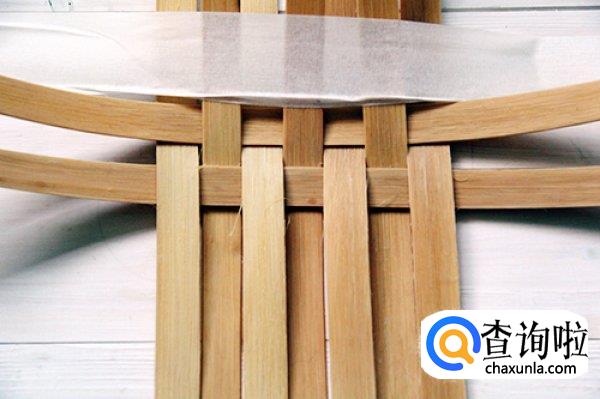 接下来我们取其他裁切好的竹条,开始横向编织,编织的时候要注意是交错进行的,不要被竹条的锋利划伤手。编织成如图所示的样子。