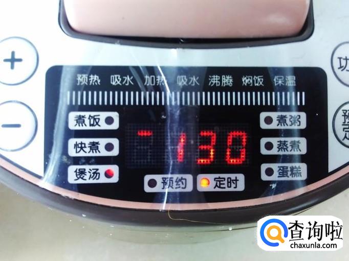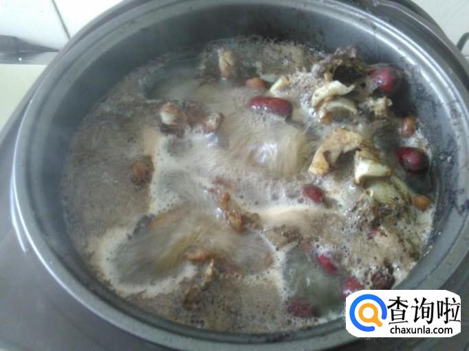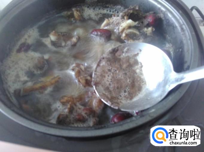 煲得30分钟左右,打开盖子把汤面上的泡泡捞丢掉。