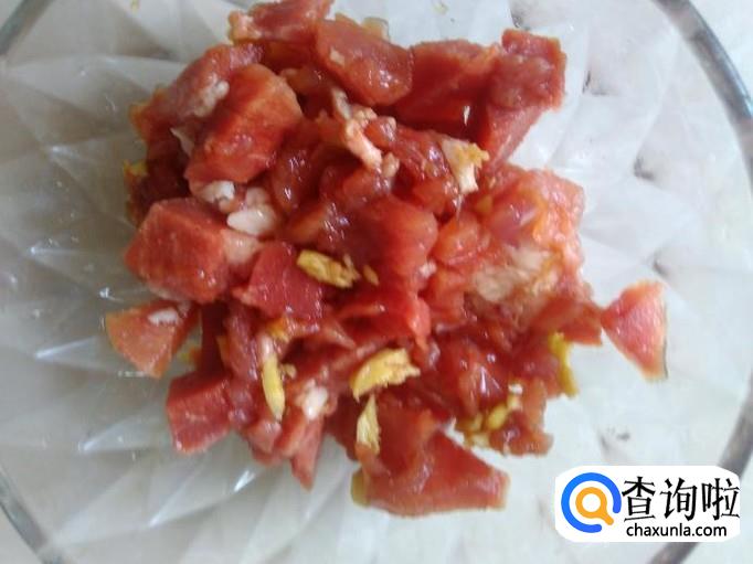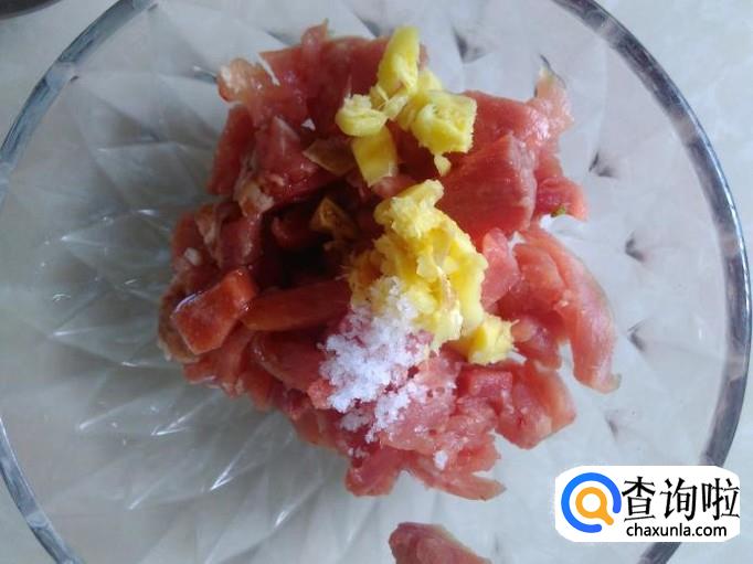 瘦肉剁成肉丁,加适量的盐、姜蓉、生抽、料酒腌制几分钟。