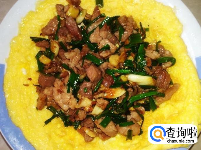 翻炒均匀,熄火,然后把肉丁铲铺到蛋饼里就可以了。