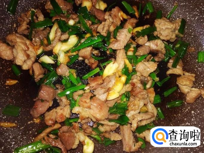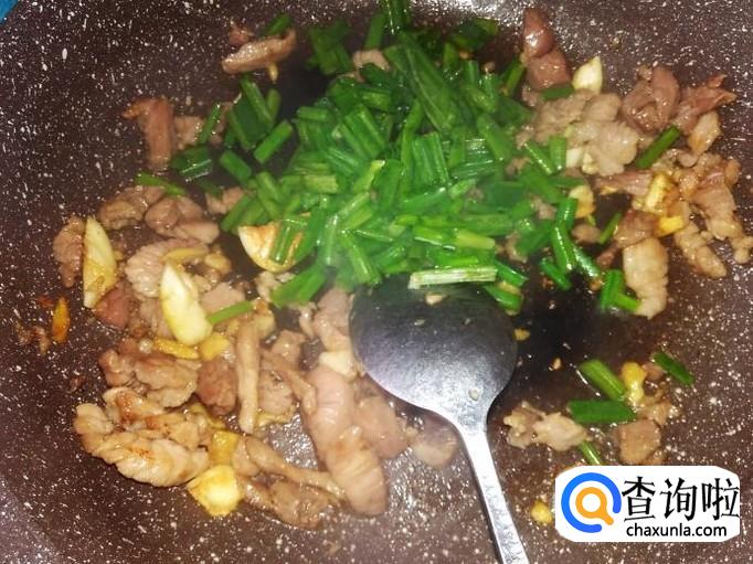 爆炒到肉丁变成金黄色,加入香葱。