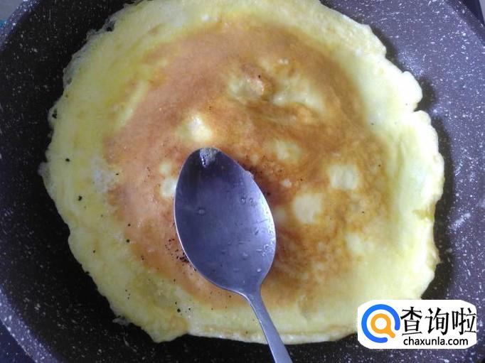 煎至鸡蛋稍微凝结,然后翻转过来再煎20秒左右。