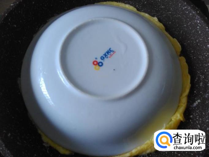 然后用碟子盖住蛋饼,压紧碟子,把平底锅翻转过来,蛋饼就完好地翻在碟子了。