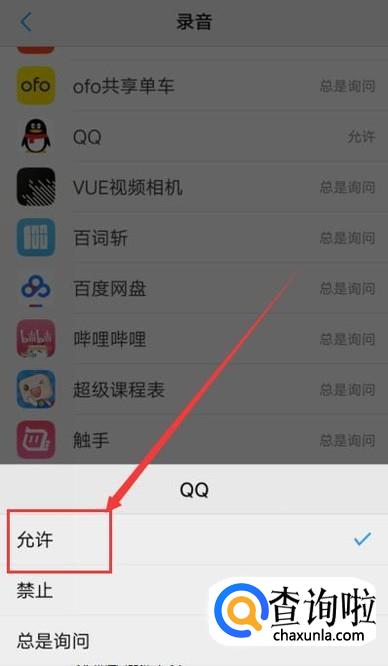 找到相应的软件,将其录音权限设置为“允许”即可,如图所示。