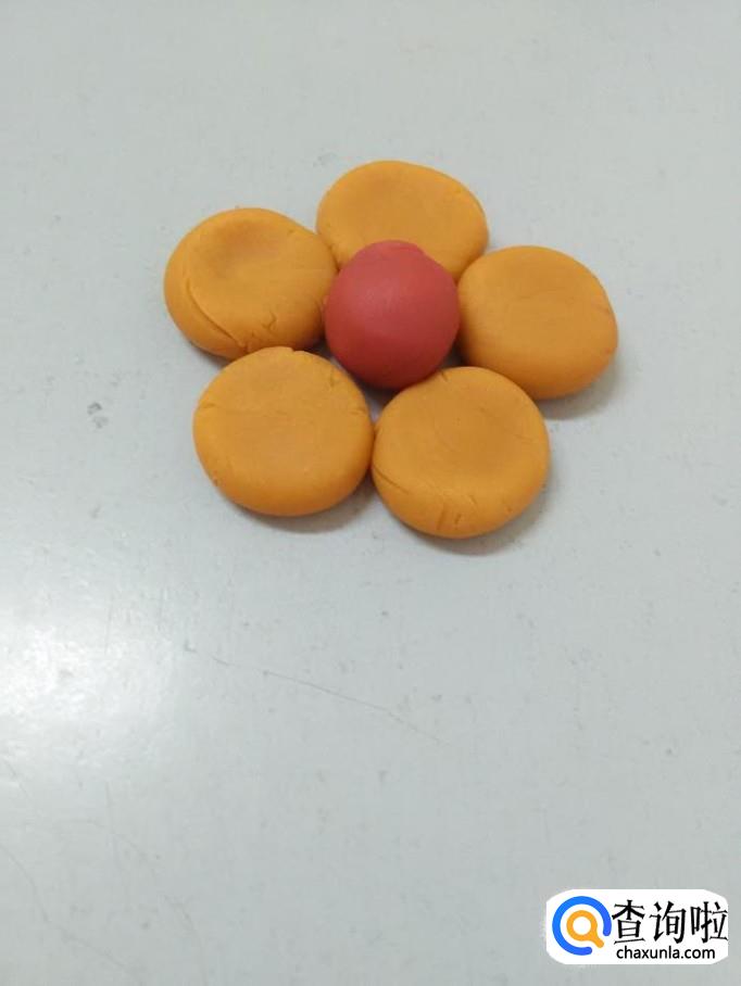 把五个圆球按成扁片,围成一朵花。